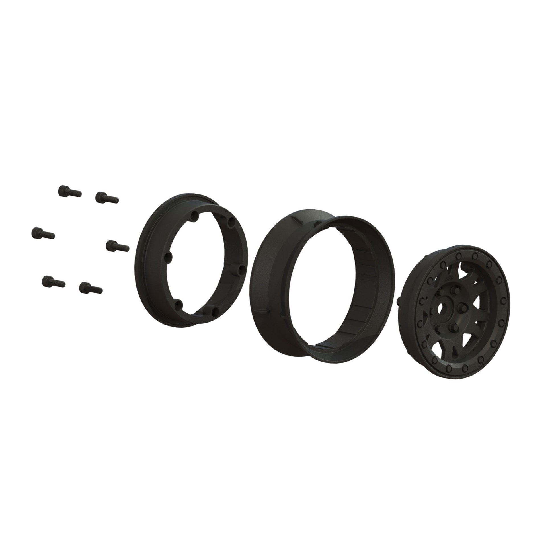 This is a pair of Impulse 1.9" Black/Silver Plastic Internal Bead-Loc Wheels. Pro-Line is proud to introduce the new Impulse 1.9" Black Plastic Internal Bead-Loc Wheels with Silver painted faux rings that are Proudly Made in the USA! These Impulse wheels are designed to not only look scale but to be super easy to use by only requiring 6 screws per wheel for mounting tires. The unique 3-piece plastic wheel design bolts together in the back and locks on to Pro-Line's incredible list of 1.9" Crawling Tires. Get your very own set of Pro-Line Impulse 1.9" Black/Silver Wheels today!