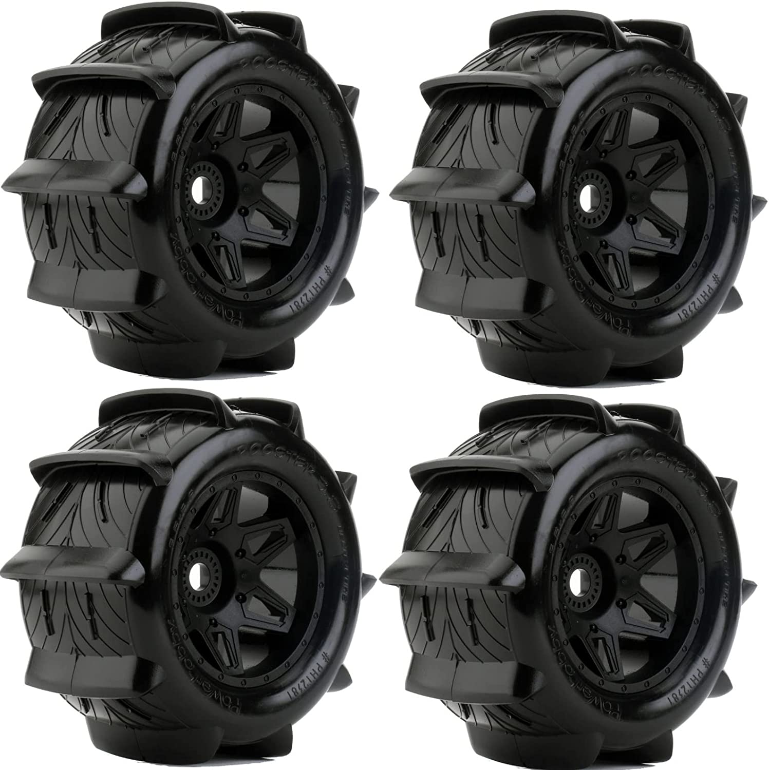 This is a pair of pre-mounted Rooster 3.8" Sand or Snow Truck Tires. These tires are belted, so no more tire ballooning. The Rooster tires provide hours of fun in the sand, snow, or even in the occasional mud pit. The eleven paddles ensure maximum performance due to the true scoop design coupled with low roll outer sidewalls.
