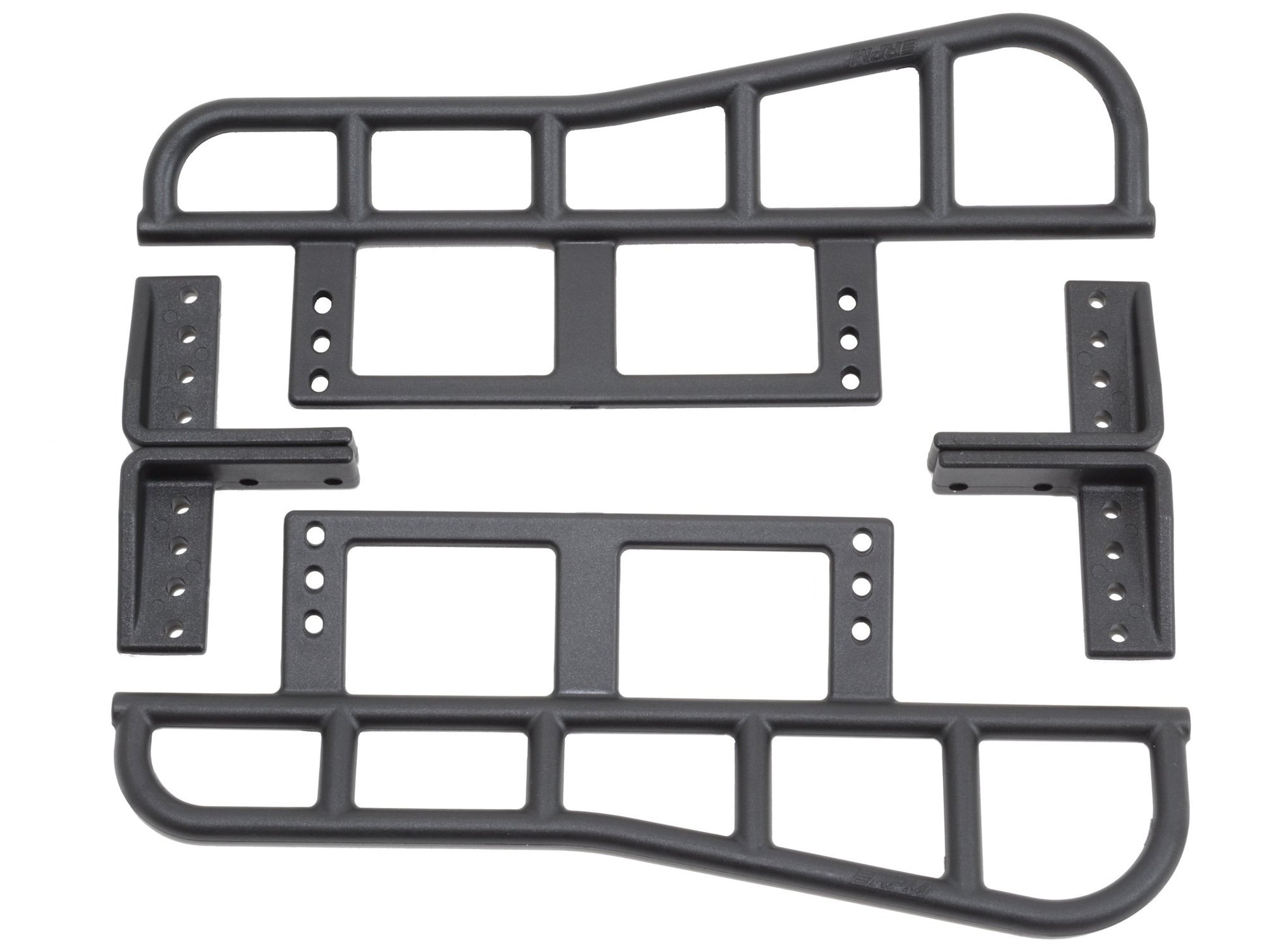 Rock Sliders are designed to resemble full-sized 2" diameter tubes, yet are molded solid from RPM engineering grade nylons for strength and durability unmatched in the R/C world. Each rock slider is designed with built-in kick out at the rear wheel, helping to guide your ride through turns normally too tight to maneuver without catching the rear tires or the bed section of your body. Each RPM Rock Slider is angled upward at 20 degrees to eliminate ground clearance issues and is one of the only sliders available that has vertical as well as lateral adjustments! Do you have your body raised just a little too high for standard sliders? No problem! RPM's mounting system allows roughly 1/4" (6mm) of upward adjustment and more room to slide them closer to the frame than stock sliders for narrow-bodied applications.