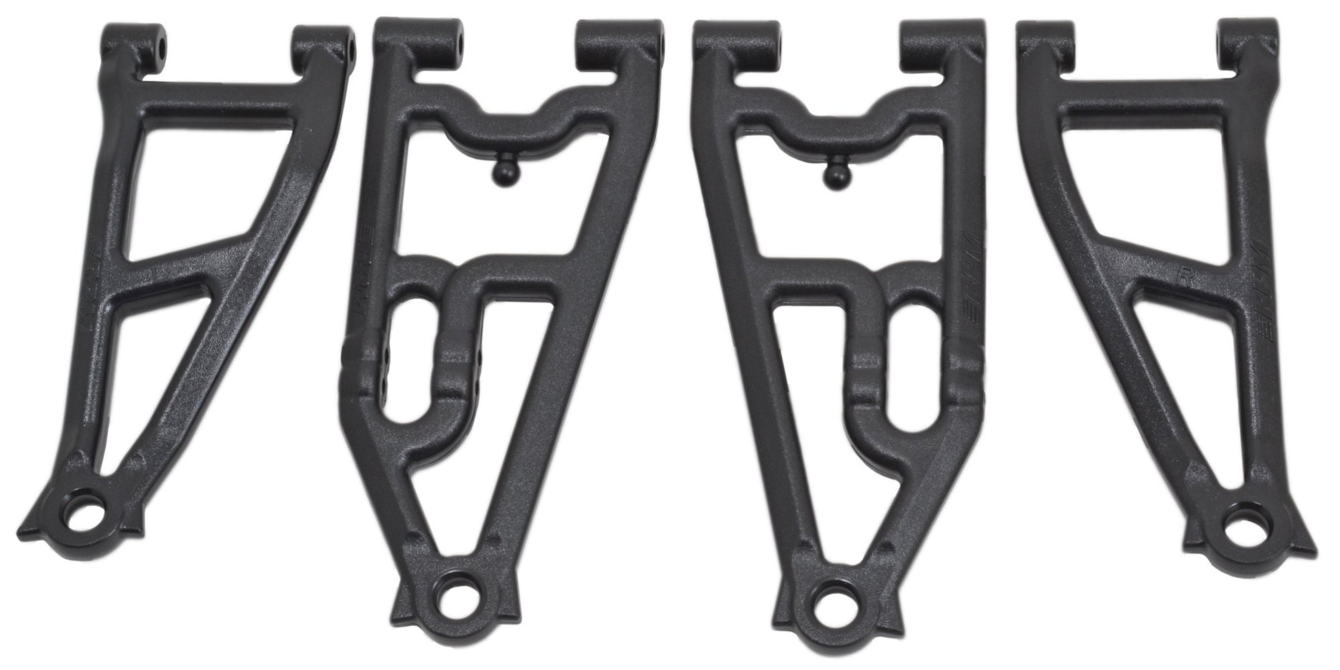 Added extra outboard shock mount Redesigned upper A-arm shape eliminates bind Replaces stock Losi #234004 Sold with 2 upper front A-arms and 2 lower front A-arms Stock Losi A-arm pivot balls required (not included)