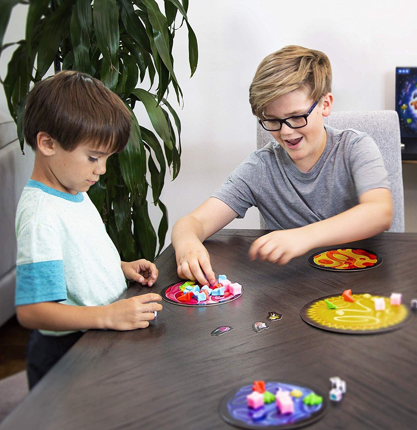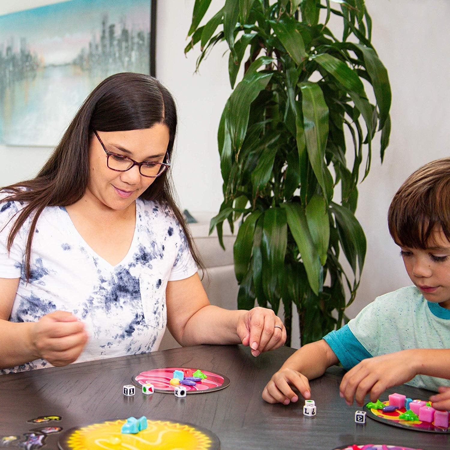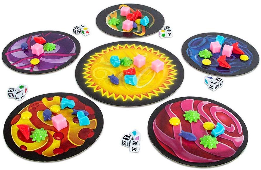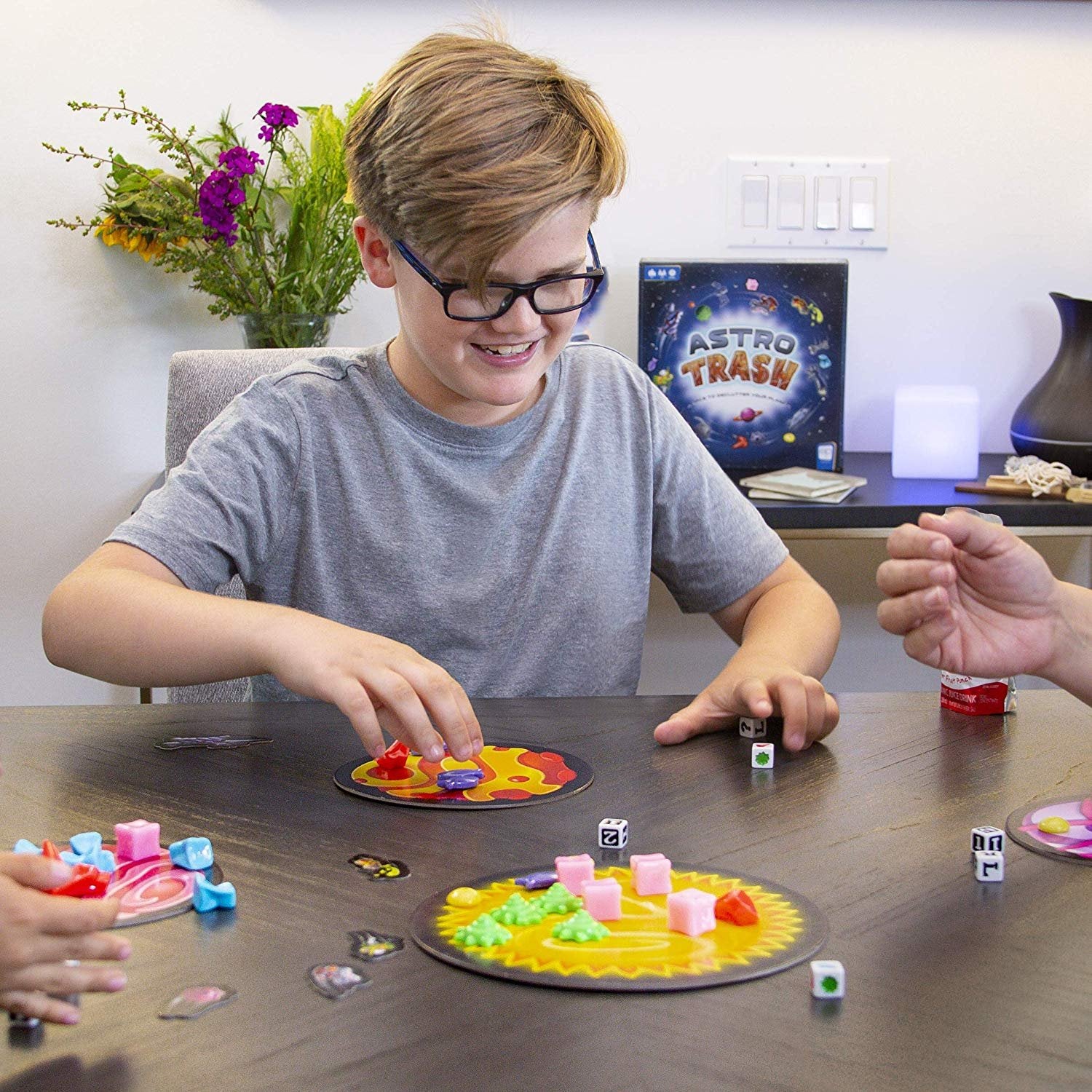 Astro Trash is a game in which each player must get rid of all the Trash on their play mat at the expense of the players to their left and right. Players simultaneously roll three dice and rapidly move the “trash” according to the direction, quantity, and color indicated on the dice