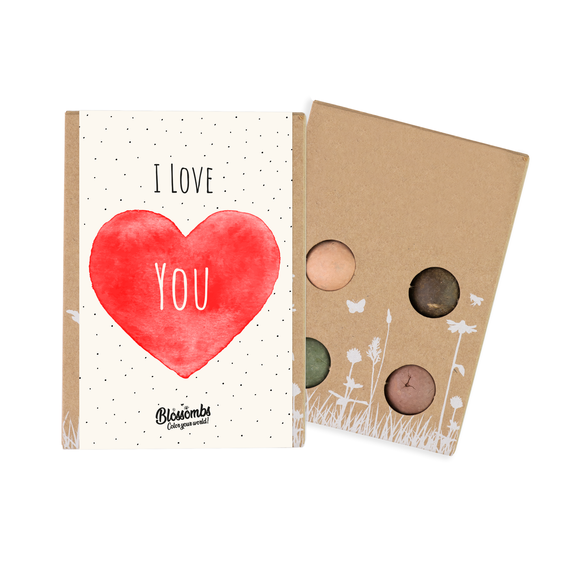 Color your world! Blossombs wildflower seed balls are made in Holland with organic seeds and 100% natural ingredients. This sweet and sustainable Valentine themed mini gift box contains 4 Blossombs. The wildflower mix includes the following: Lanceleaf Coreopsis (Coreopsis lanceolata), Dill (Anethum graveolens), Borage (Borago officinalis), Wallflower (Cheiranthus allionii), Black-eyed Susan (Rudbeckia hirta), Cornflower (Centaurea cyanus), Crimson Clover (Trifolium incarnatum), Annual Aster (Callistephus chinensis), Purple Coneflower (Echinacea purpurea) and Anise Hyssop (Agastache foeniculum). Mini gift box dimensions 2.6” x 3.6” x .63”