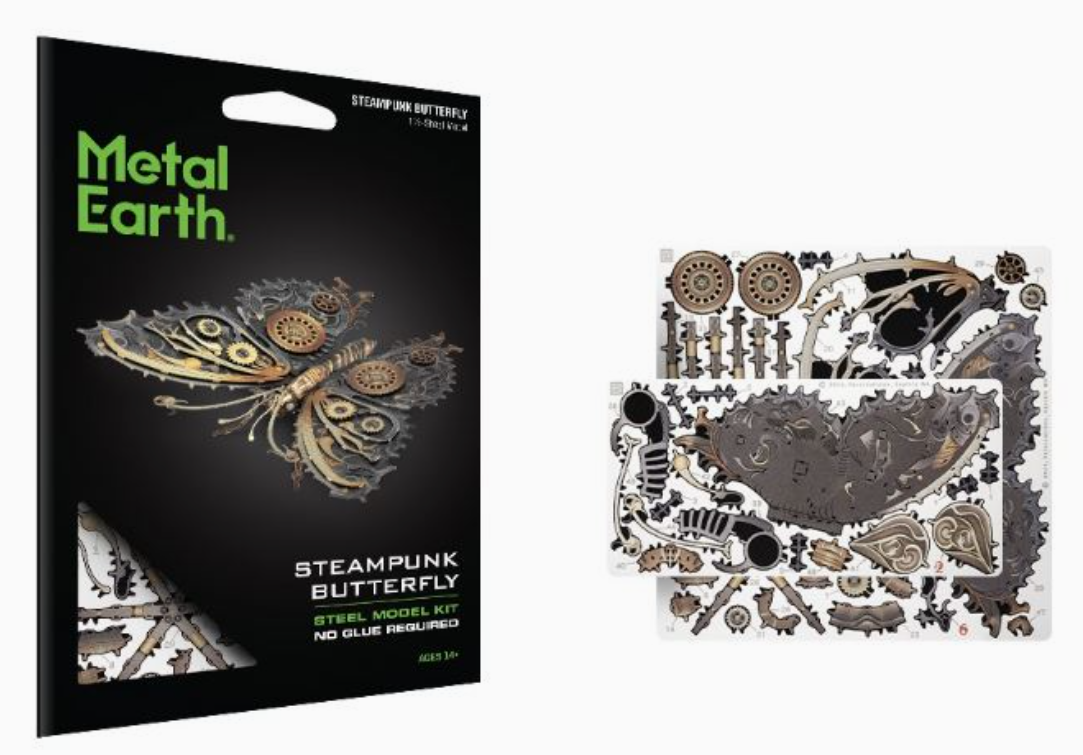 METAL EARTH DIY 3D METAL MODEL KIT of Steampunk Butterfly evokes a nostalgic sense of “a world that never was”. Where history and fantasy collide with Victorian-era industrialism.