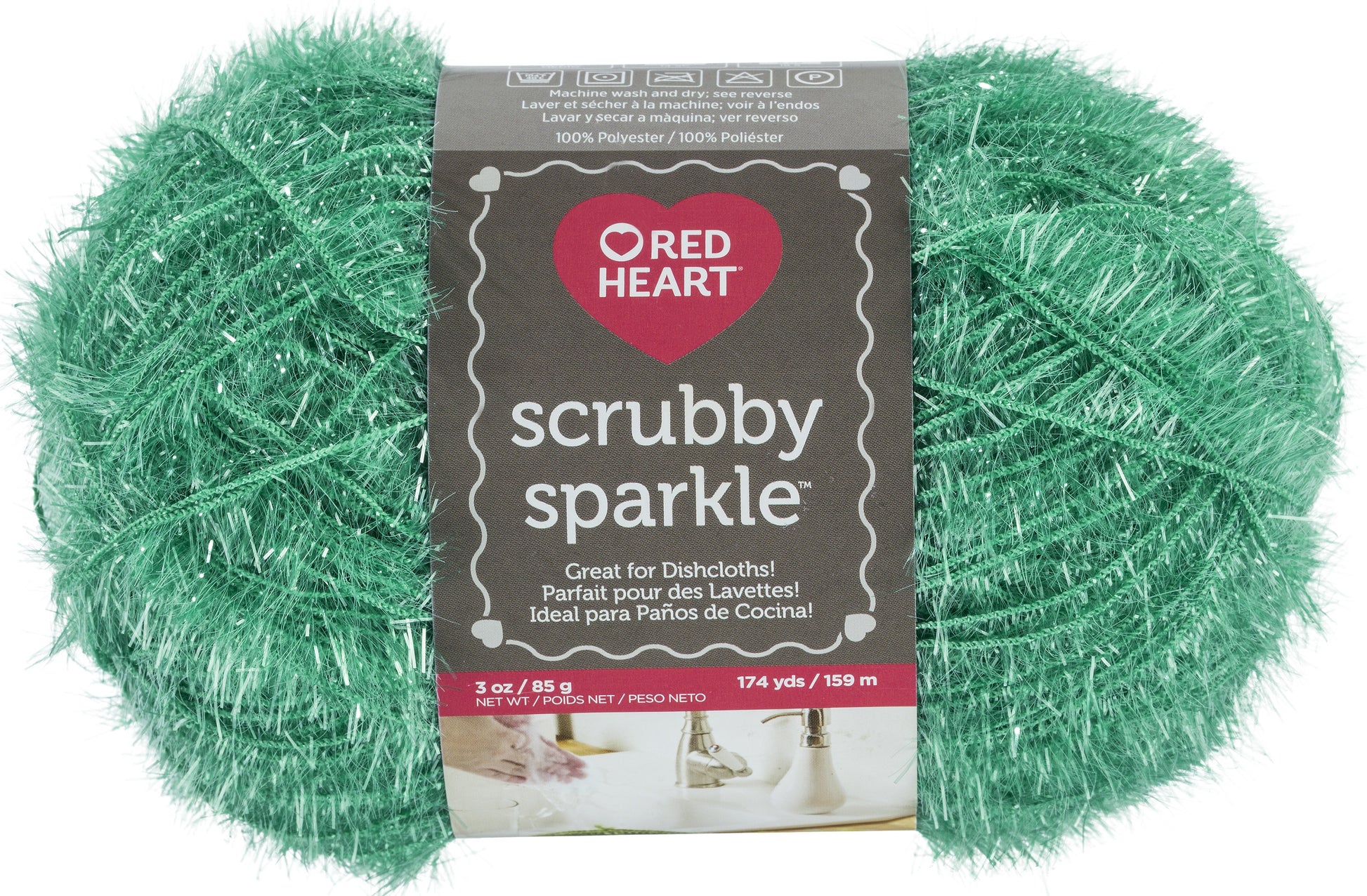 Red Heart-Scrubby Sparkle Yarn. A uniquely textured yarn with a sparkle effect great for making pan scrubbies but also great for making crafty items. Weight category: 4. Content: 100% polyester. Putup: 3oz/85g, 174yds/159m. Gauge: 18s x 24r = 4in/10cm on size US8/5mm knitting needles. Crochet: 14sc x 13r = 4in/10cm with size I-9/5.5mm crochet hook. Dyelotted: we try but are not always able to match dyelots. Care: machine was cold gently cycle, tumble dry, do not bleach or iron, dry clean with P solvents only. Comes in a variety of colors. Each sold separately. Imported.
